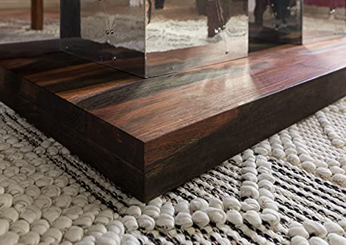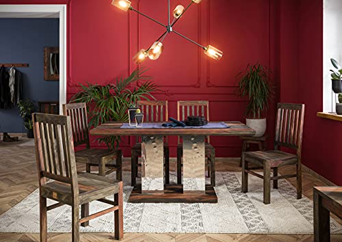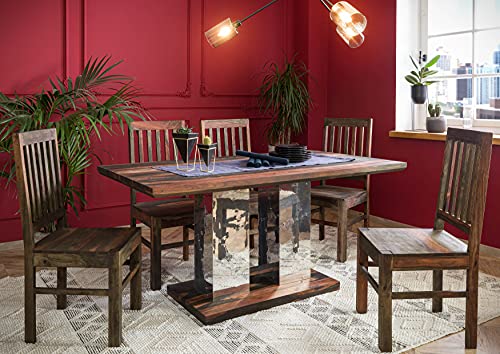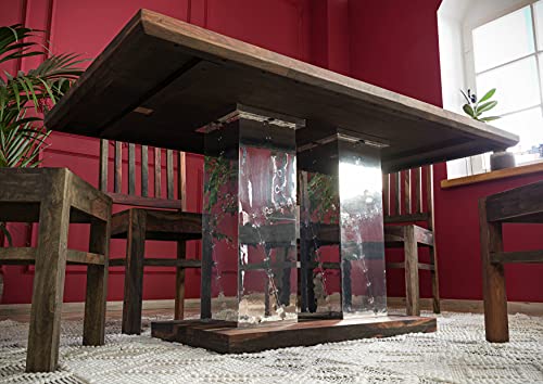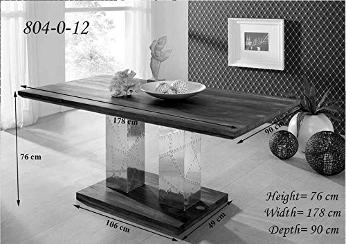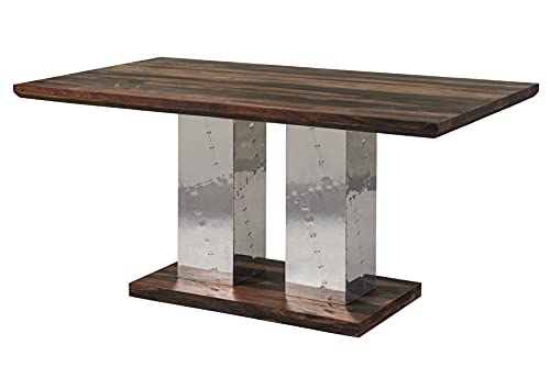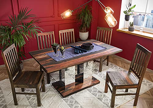 MATERIAL: Der ästhetisch besonders ansprechende Esstisch vereint massives Holz mit modernen Aluminium Elementen. Das verwendete Sheesham Holz, ist für seine auffällige Farbgebung, schöne Maserung und Stabilität bekannt.