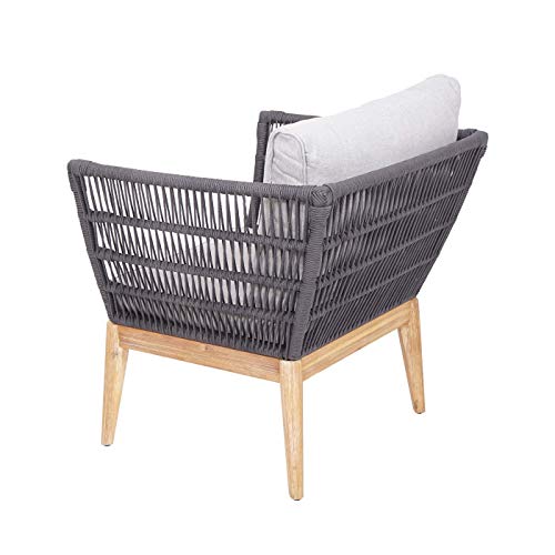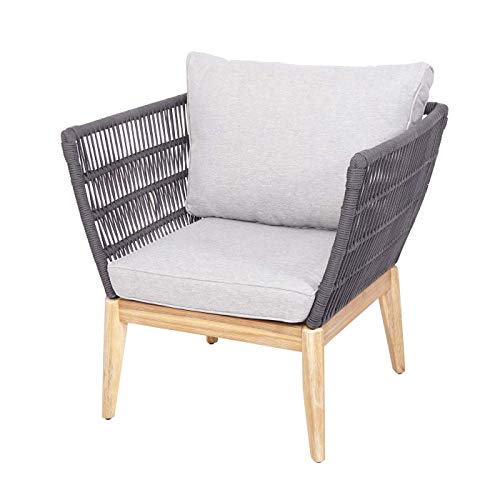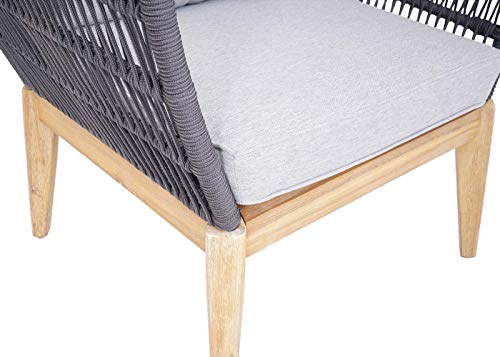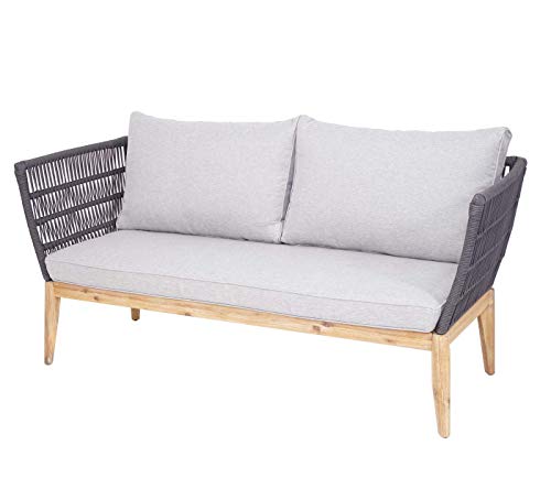 Dimensionen (HxLxB): 75x74x174cm | Material: Rahmen: Stahl + Akazienholz – Bezug: Stoff/Textil Spun Poly* (100% Polyester, 230g pro m²) – Seilgeflecht: Polyethylen (PE) | Farbe: Gestell: bieder/braun – Bezug: hellgrau – Seilgeflecht: bieder
