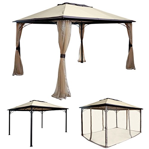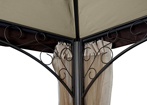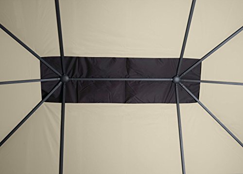 Dimensionen (HxLxB): 270x300x400cm | Material: Bezug: 100% Polyester, 180g/m² – Oberer Rahmen : pulverbeschichteter Stahl – Pfosten: Aluminium | Farbe: Farbe Tuch: cremeweiß und braun – Farbe Rahmen: eisengrau