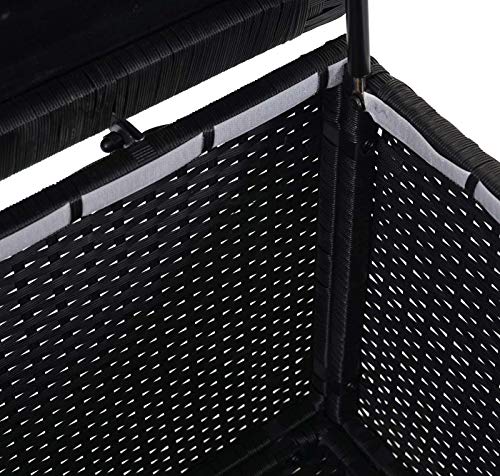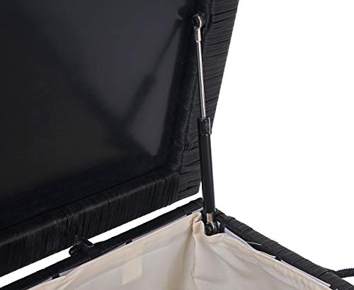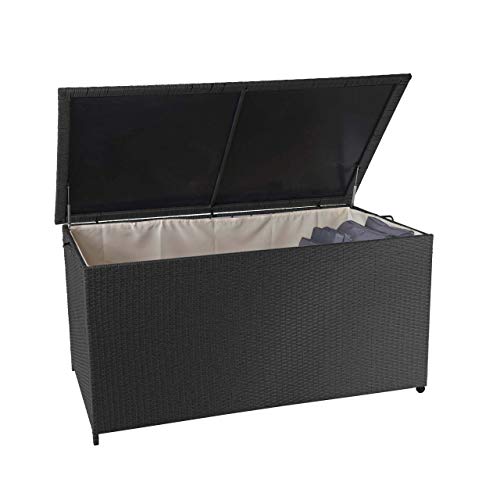 Dimensionen (HxLxB): 80x94x160cm | Material: Order: Poly-Rattan – Gestell: Pulverbeschichteter Stahl – Einlage im Deckel: PVC (Polychlorid) – Bezug: Textil (100% Polyester), 180g/m² | Farbe: Truhe: schwarz