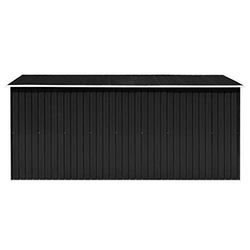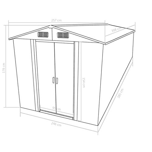 ★【 🌿 】Material: verzinkter Stahl Gesamtabmessungen: 257 x 398 x 178 cm (B x T x H) Schiebetürgröße: 80 x 154 cm (B x H) Grundfläche: 246 x 385 cm (B x T) Lüftungsöffnungen (je): 23 x 10 cm Mit 4 Lüftungsschlitzen Farbe: Anthrazit