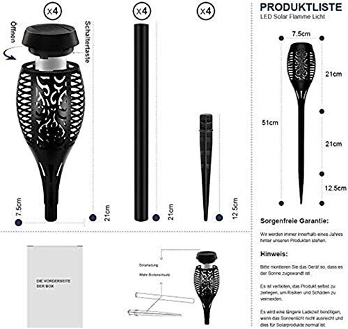 【Solares Gartenlicht mit Flammen】 Solares Gartenlicht mit 12 LEDs bietet Ihnen einen realistischen flackernden Flammeneffekt. Jede Lampe flackert warmes gelbes Licht und ahmt äußerst realistische und natürliche Tanzflammen nach.