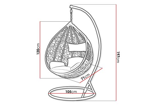 Hängesessel Santa Cruz Maße: – Breite: 105 cm, – Höhe: 197 cm, – Schlund: 105 cm – Schlund der Sitzfläche: 71 cm Leer Maße sind ca. Maße Farbkombination: – Unzeitgemäß / Unzeitgemäß – Die Farben unserer Grafik können vom Original abschweifen. Execution: – Stahlskelett – gewährleistet Sicherheit und Dauerhaftigkeit – Korb aufgebraucht Technorattan – Kissen: Polyester – Maximale Traglast: 150 kg – Passt sich an atmosphärische Einflüsse an – Einfach zu reinigen – Einfach zu montieren – Eignet sich hervorragend anstelle die Terrasse, den Balkon, den Garten oder im Haus
