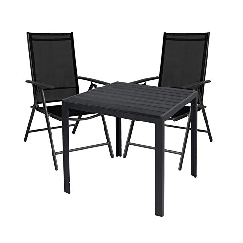 WITTERUNGSBESTÄNDIG: Material Tisch: pulverbeschichtetes Leichtmetall. Material Stuhl: pulverbeschichtetes Leichtmetall (Schwarz) und hochwertiges 2:1 Textilen (Schwarz)