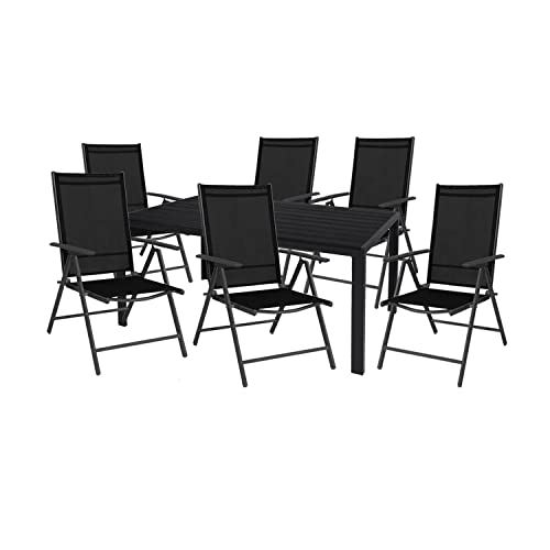Diese modernen und stilechten Leichtmetall-Textilene-Stühle fügen sich ideal in jedes Gartenambiente ein. Es haben 6 Personen genügend Platz um bequem am Tisch zu einsitzen.