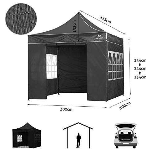 [Praktisches Design]: Die Fläche des Pavillons ist 3 m x 3 m. Es kann stufenlos in drei Höhen von 3,3 m, 3,4 m und 3,5 m eingestellt werden. Nach dem Zusammenklappen kann das Zelt in einer 163 x 35 x 24 cm großen Aufbewahrungstasche verstaut werden, die über Räder verfügt.
