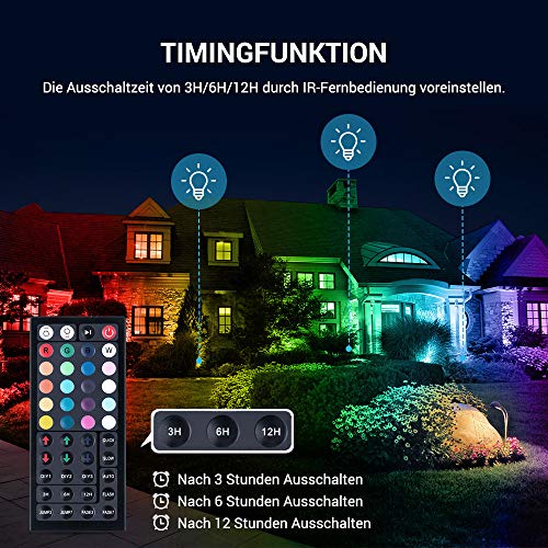 ⏰【SPEICHERFUNKTIONN & AUSSCHALTZEIT VON 3H/6H/12H EINSTELLBAR】-Egal ob Sie MustWin RGB Scheinwerfer per Ferbedienung, Netztrennung oder Zeitschaltuhr ausmachen, betreibt der bunt Außenstrahler beim Neustart in letzter Streichung. Voreinstellen die Ausschaltzeit von 3H/6H/12H durch IR-Fernbedienung, sodass müssen Sie sich nicht daran erinnern, die bunt Gartenbeleuchtung vor Schlaf oder nach Party auszuschalten. Kann Als Stimmungslicht, Partybeleuchtung, Gartendeko, Außendeko, Innendeko.