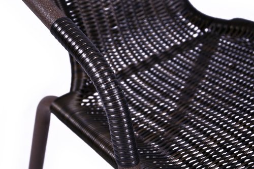 Das Gestell besteht sowohl beim Stapelstuhl als alias beim Gartentisch allesamt pulverbeschichtetem Stahl in Hammerschlag-Optik. Das dunkel-braune Polyrattan der Stühle besteht allesamt Kunststoff, ist reißfest und interessant geflochten. Ein Rattanstuhl hat ein Gesamtmaß von ca. 73 x 53 x 60 cm, ein Gewicht von ca. 3,5 kg und eine Sitzfläche von ca. 42×38 cm. Der Tisch misst im Ø 60 cm, in der Höhe: ca. 73 cm. Das Gewicht beträgt ca. 5,5 kg