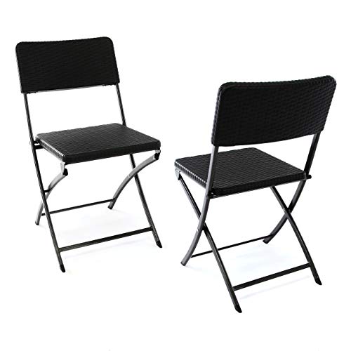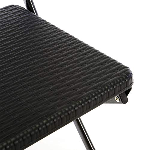 Schickes Stuhlset jeglicher Kunststoff, verarbeitet mit einer edlen Rattan-Optik in schwarz. Einfach aufzuklappen und als Folge vielerorts einsetzbar. Einerlei ob auf dem Balkon, der Terrasse oder im Garten. Gemütlichen Stunden im Freien steht hier nichts im Unauffindbar. Natürlich können Sie die Stühle hingegen alias in den eigenen vier Wänden einetzen, die Füße sind mit Gummischonern versehen. Robost, zäh und pflegeleicht. Verschmutzungen können mit einem feuchten Tuch einfach abgewischt werden. Werden die Stühle nicht mehr benötigt lassen sie sich im Handumdrehen zusammenklappen und platzsparend verstauen.Technische Details je Stuhl:Material: Metallgestell, Hartplastikplatte mit schwarzer Rattan-OptikMaße Sitzfläche: ca. 40 x 38 cmLehne: ca. 22 x 43 cmSitzhöhe: ca. 45 cmGesamthöhe ca. 80 cmgeklappt: ca. 95 x 26 cmklappbarwetterfest und pflegeleichtGewicht ca. 4,5 kgLieferumfang: 2x Klappstuhl