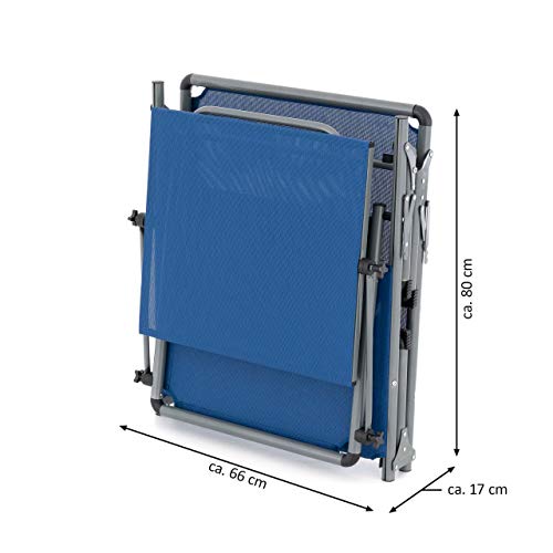 Die Relaxliege ist mit einem pflegeleichten, wasserabweisenden 2×2 Textilene 600g Polyester bezogen. Das stabile graue Aluminiumrohrgestell mit drei Standbeinen ist außerordentlich robust. Rutschfeste Füße mit Schutzkappen sorgen zudem statt einen stabilen Haltegriff.