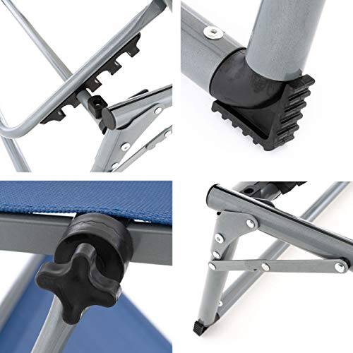 Die Relaxliege ist mit einem pflegeleichten, wasserabweisenden 2×2 Textilene 600g Polyester bezogen. Das stabile graue Aluminiumrohrgestell mit drei Standbeinen ist äußerst robust. Rutschfeste Füße mit Schutzkappen sorgen zudem für einen stabilen Halt.