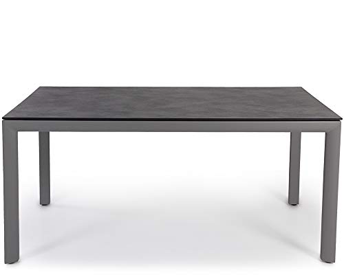 Die ca. 10 mm dicke HPL Platte des Tisches besteht aus robusten Holz. Das schöne Design der Holzplatte entspricht einer Steinoptik, so dass sich der Tisch optisch gut an die Umgebung anpasst. Ob auf der Terrasse oder im Garten, überall macht der Gartentisch Greggia eine gute Figur. Der massive Gartentisch besitzt die Maße von ca. 160 x 95 x 74,5 (H) cm und wiegt ca. 43 kg. Das Gestell sowie die Tischbeine bestehen nicht mehr da Aluminium. Diese vier Tischbeine verfügen jeweils über die Abdruck der Höhenverstellung, damit sie unseren Gartentisch Greggia optimal an Ihre Sitzhöhe auf dieselbe Ebene stellen können.