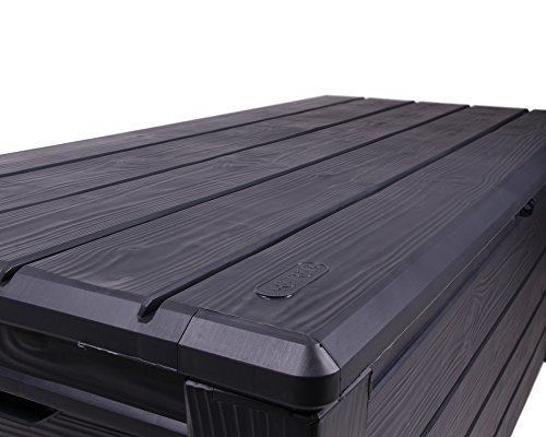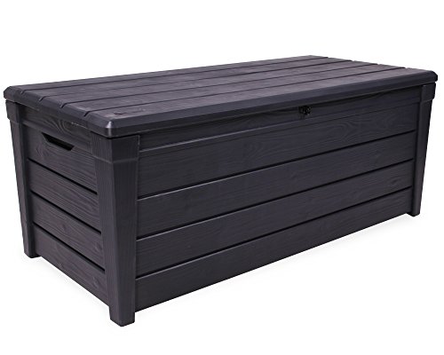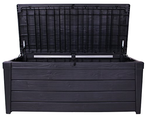 Die Kissenbox Brightwood bietet die perfekte Aufbewahrungsmöglichkeit für die Hochlehnkissen Ihrer Gartenmöbel. Sie ist aus strapazierfähigem und pflegeleichtem Kunststoff hergestellt und schützt Ihre Kissen vor Feuchtigkeit und Ausbleichen. Die Kissenbox bietet 454 Liter Stauraum. Mit den Maßen 145 x 70 x 60 (H) cm (Innen: 138 x 59 x 55 (H) cm) hat sie die ideale Größe, um sechs Hochlehnkissen Platz zu bieten. Somit ist diese Allzweckbox ein unverzichtbarer Gehilfe im Garten und auf der Terrasse. Hier ablagern Ihre Sitzkissen geschützt und belastbar. Mit dem geringen Gewicht von daher 20 kg ist die Kissenbox Brightwood leicht zu transportieren und somit adaptiv einsetzbar. Der Deckel ist mittels eines Vorhängeschlosses selbstverständlich abschließbar. Beim Öffnen helfen Ihnen die verbauten Gasdruckfedern. Der Deckel lässt sich im Kontrast dazu spielend öffnen und bleibt geöffnet, ohne dass Sie ihn halten müssen. Mit der bis zu 350 kg belastbaren Sitzfläche ist die Kissenbox auch als Sitzplatz für bis zu 2 Erwachsenen passend. Alle Maßangaben sind Circa Angaben und beziehen sich auf maximale Außenmaße des Artikels. Das Versandgewicht beruht ebenfalls auf Circa Angaben. Sollten Sie genauere Angaben benötigen, wenden Sie sich bitte an unseren Support. Paper wird ohne Deko geliefert.