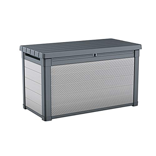 hochwertig und robust, zur Stabilität wurde die Box mit Metall verstärkt, praktische Gasdruckfedern heben den Deckel fast von alleinig, hochwertiger Kunststoff, UV-feststehend und wetterfest, für den ganzjährigen Einsatz im Außenbereich angebracht, kann aka im Winter draußen bleiben, praktisch wartungsfrei, kein Streichen, kein Schleifen