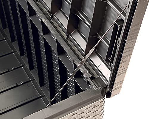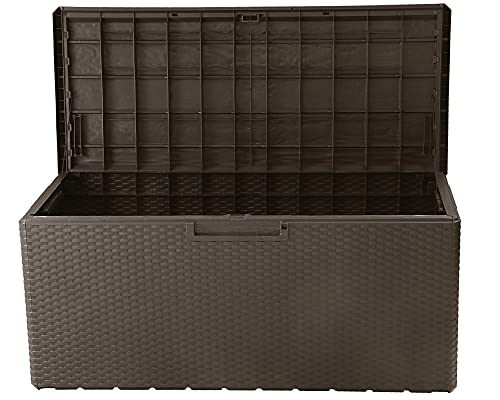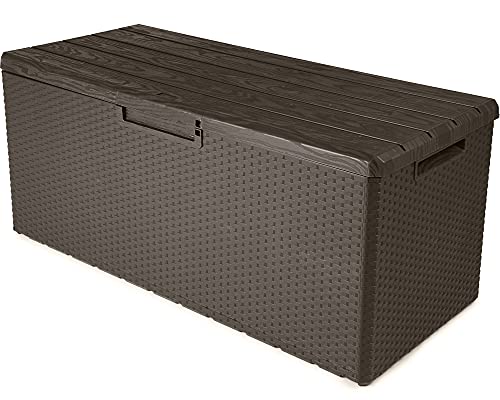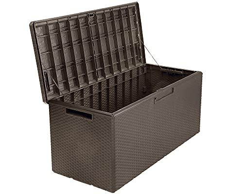 Sechs Hochlehnkissen passen leicht in die Gartenbox, da sie über ein riesiges Fassungsvermögen von 340 Liter verfügt. Dieses stattliche Volumen ergibt sich aus den Außenmaßen von ca. 124 x 54 x 56 (H) cm und innen ca. 115 x 47 x 52 (H) cm.