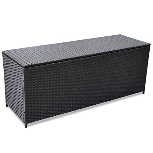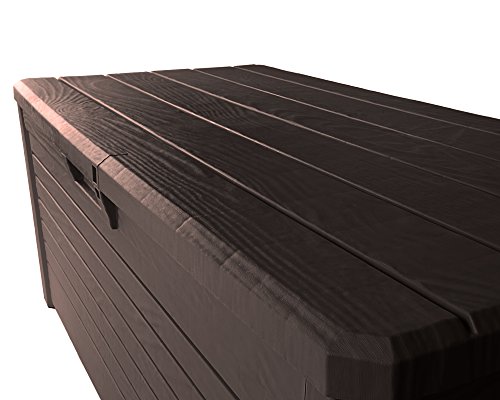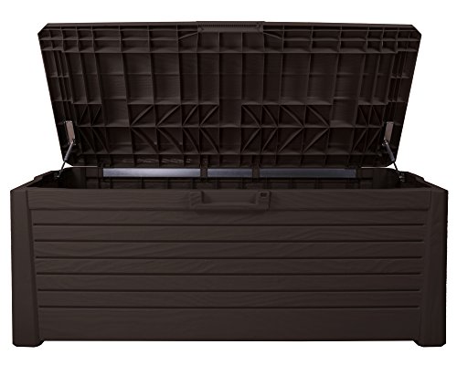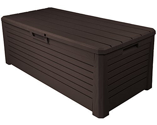 Diese Kissenbox bietet mit den Außenmaßen von ca. 147 x 71 x 63 (H) cm (innen ca. 138 x 62 x 55 (H) cm) ausreichend Platz und verfügt über 550 Liter Stauraum! Darin können Sie genügend Hochlehnerkissen für Ihre Gartenmöbel aufbewahren. Zwar auch ganze Sortimente an Blumentöpfen und Gießkannen können in der Gartenbox gelagert werden.