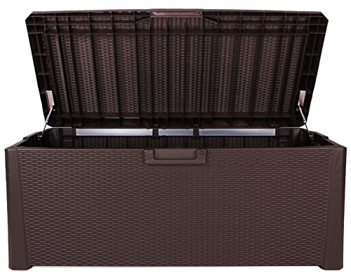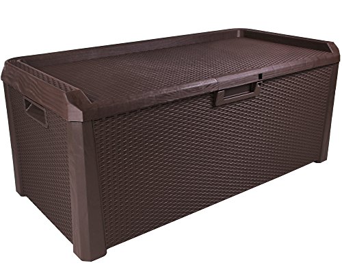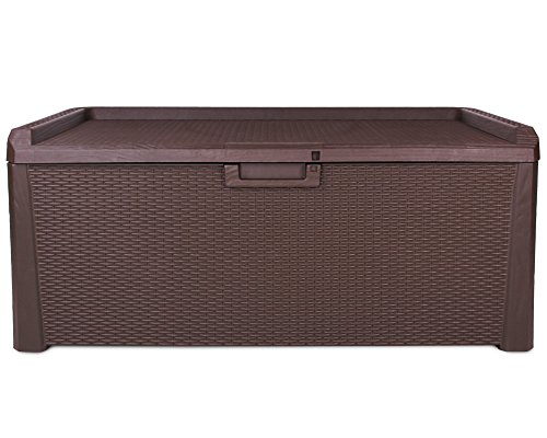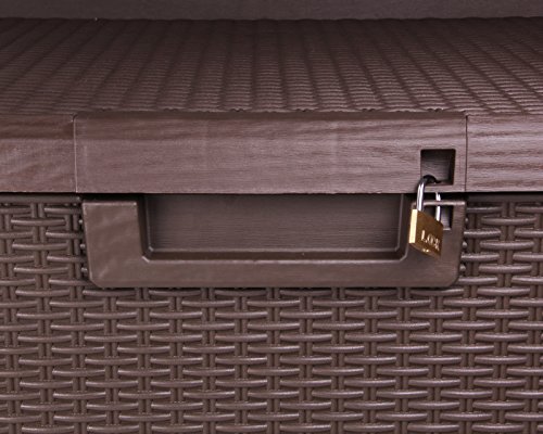 Mit dem geringen Gewicht von Gewiss 22 kg ist die Kissenbox leicht zu bewegen und somit flexibel einsetzbar. Selbstverständlich ist der Deckel mittels eines Vorhängeschlosses abschließbar (nicht im Lieferumfang enthalten). Diese Gartenbox ist im Design der Rangfolge Rattan hergestellt und harmoniert somit perfekt mit anderen Gartenmöbeln und Schränken dieser Rangfolge. Die Allzweckbox Santo ist gefestigt und pflegeleicht gebaut und lässt ich durch die Griffmulden gut zu bewegen.