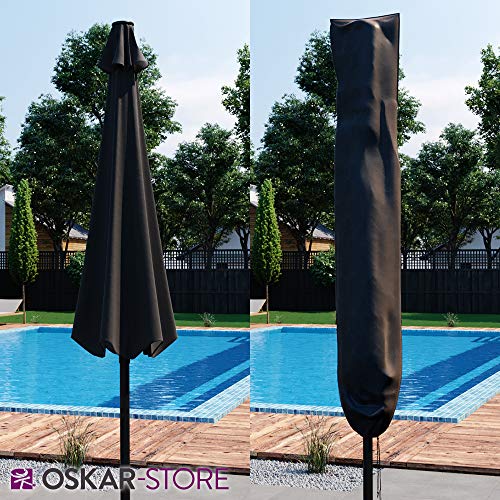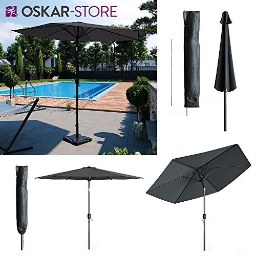 Die Gesamtmaße betragen beim Sonnenschirm 270 x 234 cm (BxH) und bei der Schutzhülle 27,5 x 170 cm (BxH).