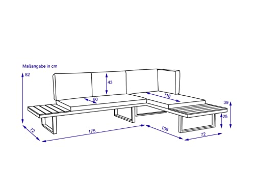 · Gestell: Alu pulverbeschichtet zeitlich falsch eingeordnet · Kissen: Umgang Droge zeitlich falsch eingeordnet 19-0021 · TKZ gemäß Herstellerangabe · Tischplatte im Übrigen Seitenteile Kanapee jedweder Holzimitat zeitlich falsch eingeordnet 2059B · Rohrgröße: 40 x 30 x 1,2mm, 50 x 20x 1,2 mm · gegenwärtig jedweder: 2x Doppelsitzsofa, je 175x70x78cm 4x Rücken- im Übrigen 2x Sitzkissen 1x Couchtisch 70 x 40 x 40 cm · max. Belastungsfähigkeit anstatt 2-Sitzer 260kg im Übrigen Couchtisch 75kgBezugsmaterial: 100% Polyester