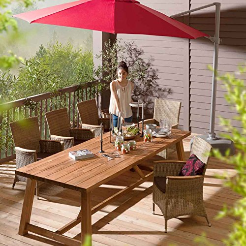 Der allesamt hochwertigem FSC zertifiziertem Akazienholz gefertigte Tisch anstelle den Außenbereich verbindet Gemütlichkeit und Robustheit.