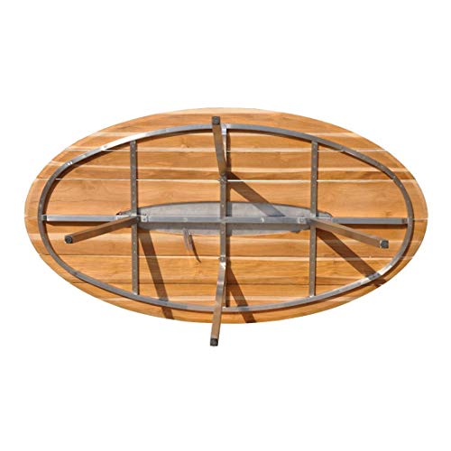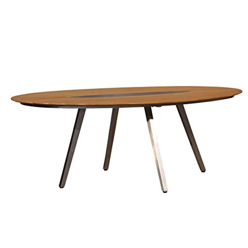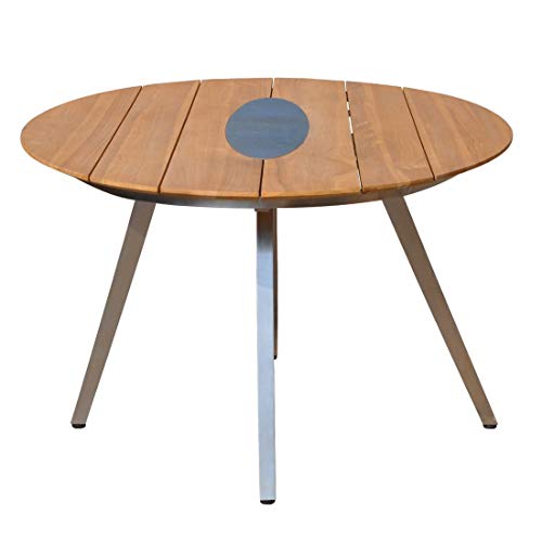 Moderne und dagegen rustikale Optik, durch die Kombination der Edelstahleinlage in der Tischplatte und Teak-Holz