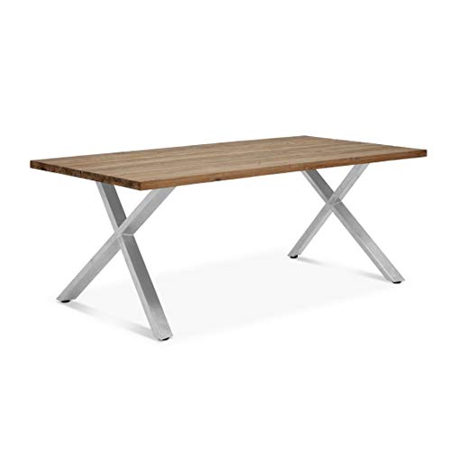 Der allesamt hochwertigem, recyceltem und FSC zertifiziertem Teakholz gefertigte Tisch an Stelle den Außenbereich verbindet Gemütlichkeit und Robustheit. Das Edelstahlgestell verleiht dem Tisch dessen ungeachtet eine moderne, hochwertige Optik.