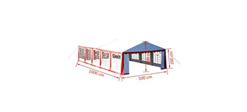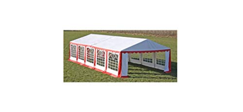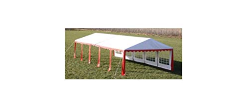 Maße: 10 x 5 x 2,80 m. Traufhöhe/Durchgangshöhe: 2 m. Farben: rot-weiß. Rahmen: Eisen. Zeltmaterial: PVC 500g / m². Rohrdurchmesser: 38 mm.