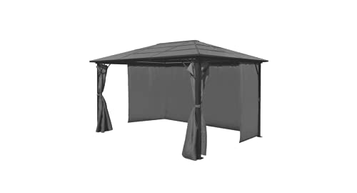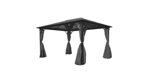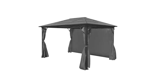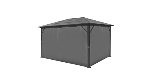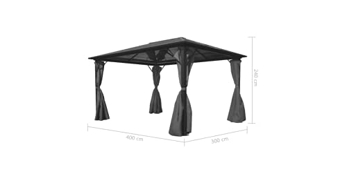 Material: 100 % Aluminiumrahmen und Stoffdach. Dachmaterial: PC-Platten. Maße: 400 x 300 x 240 cm (L x B x H). Traufhöhe/Durchgangshöhe (wo Menschen durchgehen können): 189 cm. Dicke der PC-Platten: 6 mm. Inkl. 4 Seitenwandvorhänge mit Reißverschluss. Material: Polyester: 100%.