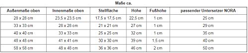 Maße gegenAußenmaße obenInnenmaße obenStellflächeHöheFußhöhepassender Untersetzer NORA28 x 28 cm23,5 x 23,5 cm17,5 x 17,5 cm22,5 cm1 cm25 cm33 x 33 cm28 x 28 cm21 x 21 cm27 cm1 cm29 cm40 x 40 cm33 x 33 cm25 x 25 cm32 cm1 cm35 cm48 x 48 cm41 x 41 cm30 x 30 cm39 cm1,5 cm40 cm58 x 58 cm48 x 48 cm36 x 36 cm46 cm2 cm50 cm