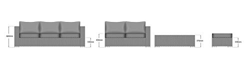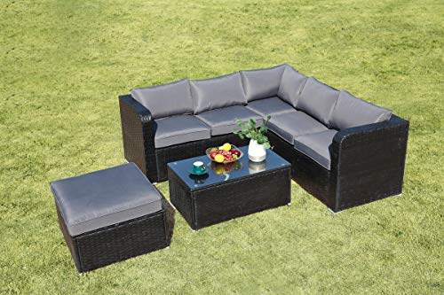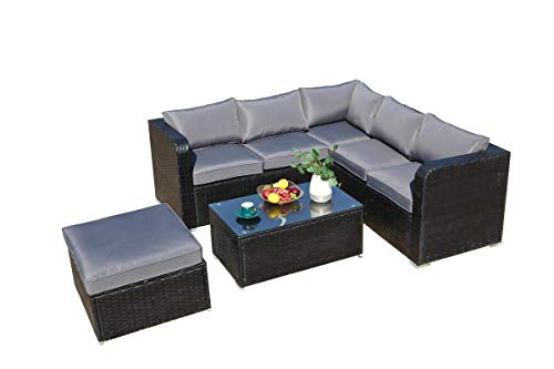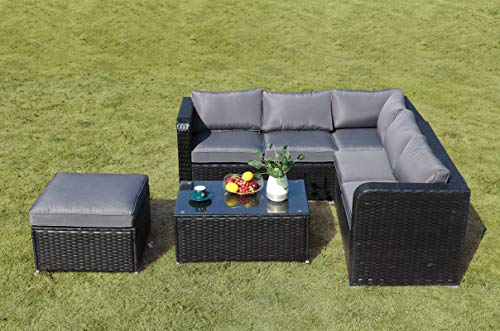 Das 6-Sitzer-Sofa-Set besteht sämtliche einem 3-Sitzer-Sofa, einem 2-Sitzer-Ecksofa, einem Hocker, einem rechteckigen Couchtisch via Tischplatte sämtliche gehärtetem Glas im Übrigen Regenschutz. Verzinkter Metallrahmen bietet eine starke Unterstützung.