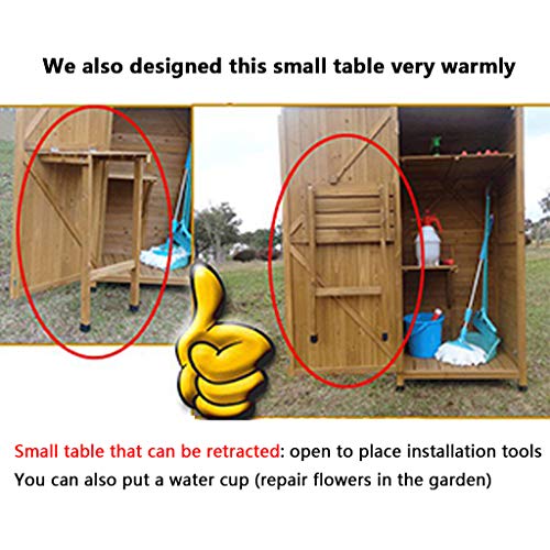 【Abschließbare Tür und klappbarer Holztisch】 -Die Tür des Gartenhauses kann einfach mit einem Holzriegel geschlossen und versperrt werden. Hinter der Tür befindet sich ein kleiner Holztisch, an dem Sie Werkzeuge und Wassergläser (bei der Reparatur des Gartens) unterbringen können.