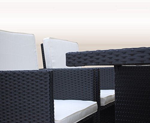 【DEUTSCHE Marke】【100% EIGENE Herstellung 】 【 8 Jahre GARANTIE auf die UV-Beständigkeit gibt es aber bei Ragnarök-Möbeldesign (woanders bekommen Sie KEINE Garantie auf die UV-Beständigkeit) 】 große sehr edle Esstisch Garnitur mit Platz für bis zu 8 Personen. Polyrattan in Vulkan Schwarz