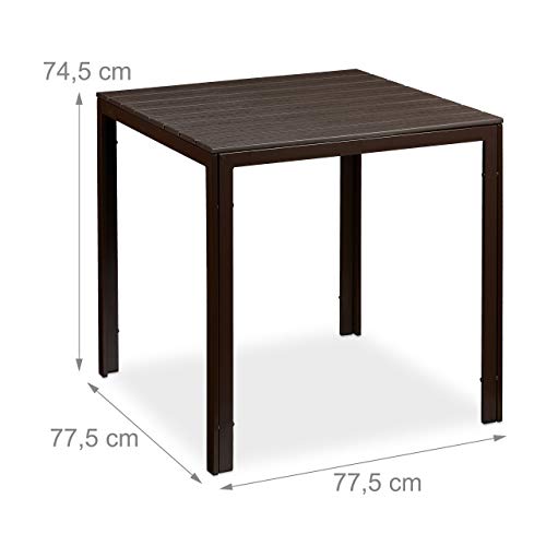 Eckig: Quadratischer Gartentisch in dunklem Braun – Maße H x B x T: ca. 74,5 x 77,5 x 77,5 cm