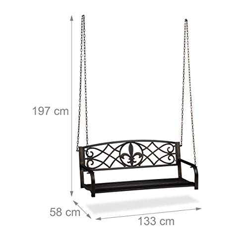 Ein gemütliches Plätzchen im Garten oder auf der Terrasse ist der Ruhepol im Alltag. Diese Bankschaukel mit geschwungenen Aufziehen im Vintage Design ist der ideale Ort, um eine wohlverdiente Pause zu verbringen. Mit breiten Armlehnen und einer großen Sitzfläche ist die Schwebebank bequem und praktisch zugleich. Die massiven Ketten der Verandaschaukel sorgen dabei für einen sicheren Halt und ein entspanntes Schaukeln. Die Hollywoodschaukel besteht aus robustem Metall.Hängebank im Detail- Gesamtmaße H x B x T: ca. 197 x 133 x 58 cm- Maße Bank H x B x T: ca. 52 x 133 x 58 cm- Maße Sitzfläche B x T: ca. 117 x 41 cm- Höhe Rückenlehne: ca. 34 cm- Max. Traglast: ca. 200 kg- Gewicht: ca. 15,3 kg- Material: Stahl, Gusseisen- Farbe: Schwarz, BronzeDekorative Vintage Gartenschaukel- Für Garten, Terrasse und Veranda- Bietet bequem Platz für 2 Personen- Geschwungenes Design für Sitzkomfort- Massive Ketten für stabilen Halt- Gestaltet im rustikalen Antik DesignLieferumfang- 1x Schaukelbank in Einzelteilen- Mit Montagematerial und Anleitung- Dekoartikel sind im Lieferumfang nicht enthalten