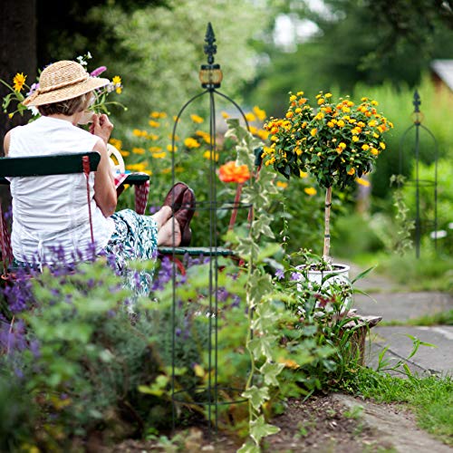 Diese Blumengitter geben nicht jedoch Rank- und Kletterpflanzen den nötigen Halt beim Wachsen, sondern sind auch selbst äußerst hübsch anzusehen. Mit ihrer runden Form und der Schmuck-Spitze tragen die Pflanzenrankhilfen zur dekorativen Gartengestaltung bei. Zier- und Nutzpflanzen wie kleine Rosengewächse oder aromatische Beeren und Tomaten werden mit den Blumenspalieren aus Metall gekonnt in Szene gesetzt. Dank des praktischen Sets geben Sie zwei Pflanzen gleichzeitig Halt. Für einen sicheren Stand der freistehenden Obelisken stecken Sie die Stangen einige Zentimeter abgrundtief in das Beet oder einen Blumenkübel.Rankhilfen im Detail- Material: Eisen (pulverbeschichtet)- Farbe: Dunkelgrün- Rohrdicke: ca. 4 mmSet aus 2 Ranktürmen- Großer Ranhilfe H x D: ca. 99,5 x 19 cm- Gewicht: ca. 0,7 kg- Kleiner Ranhilfe H x D: ca. 80 x 15,5 cm- Gewicht: ca. 0,5 kg2 Rankobelisken für rankende Gewächse im Garten- Unterstützt Wachstum von Nutz- und Kletterpflanzen- Obelisken zieren Garten oder Blumenkübel auf Terrasse und Balkon- Pulverbeschichtetes Metallgerüst ist witterungsbeständig- Dekorative Spitze macht die Rankhilfe zu einem Hingucker- Zum Aufbau Ober- und Unterteil zusammenstecken und Spitze einschraubenLieferumfang- 2 x Rankhilfe in Einzelteilen- Dekoartikel sind nicht im Lieferumfang enthalten