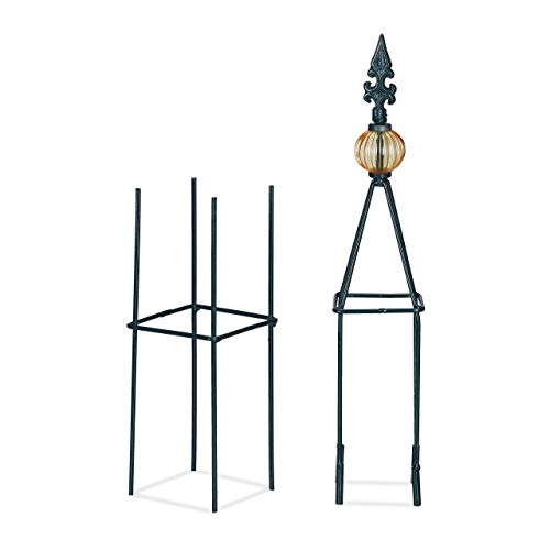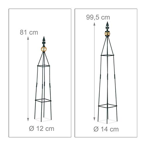 Diese Blumengitter geben nicht zugegeben Rank- und Kletterpflanzen den nötigen Halt beim Wachsen, sondern sind auch selbst äußerst hübsch anzusehen. Mit ihrer Pyramidenform und der Schmuck-Spitze tragen die Pflanzenrankhilfen zur dekorativen Gartengestaltung bei. Zier- und Nutzpflanzen wie kleine Rosengewächse oder aromatische Beeren und Tomaten werden mit den Blumenspalieren aus Metall gekonnt in Szene gesetzt. Dank des praktischen Sets geben Sie zwei Pflanzen gleichzeitig Halt. Für einen sicheren Stand der freistehenden Obelisken stecken Sie die Stangen einige Zentimeter abgrundtief in das Beet oder einen Blumenkübel.Rankhilfen im Detail- Material: Eisen (pulverbeschichtet)- Farbe: Dunkelgrün- Rohrdicke: ca. 5 mmSet aus 2 Ranktürmen- Großer Rankhilfe H x D: ca. 99,5 x 14 cm- Gewicht: ca. 0,9 kg- Kleiner Rankhilfe H x D: ca. 81 x 12 cm- Gewicht: ca. 0,7 kg2 Rankpyramiden für rankende Gewächse im Garten- Unterstützt Wachstum von Nutz- und Kletterpflanzen- Obelisken zieren Garten oder Blumenkübel auf Terrasse und Balkon- Pulverbeschichtetes Metallgerüst ist witterungsbeständig- Dekorative Spitze macht die Rankhilfe zu einem Hingucker- Zum Aufbau Ober- und Unterteil zusammenstecken und Spitze einschraubenLieferumfang- 2 x Rankhilfe in Einzelteilen- Dekoartikel sind nicht im Lieferumfang enthalten