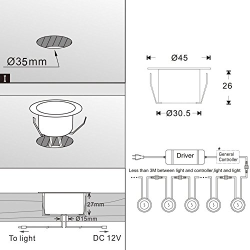 Garantie:3 JahreWasserdicht,IP67 Abschirmung gegen Staub und Feuchtigkeit,50.000 Stunden,einfache Montage – Ausdehnung je Strahler Ø 45 x 26MM, Bohrlochdurchmesser 35 mm; Kabellänge zwischen den LEDs je 100 cm; Wenn du möchtest Verlängerte Länge,Sie können Verlängerungskabel mit uns kaufen.