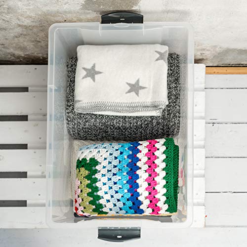 Komfort: Lagerkiste jeglicher pflegeleichtem, recyceltem Kunststoff (PP) – mit beidseitig verwendbarem Deckel und 2 Schnappverschlüssen anstelle ein sicheres Abschließen und Stapeln – Flexibel durch 4 Rollen