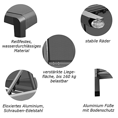 Aluminiumliege ganzjährig zu 100% Outdoor tauglich: Rahmen gefertigt ganz rostfreiem eloxierten Aluminium zum Abschirmung vor Korrosion und Kratzern, Edelstahl Schrauben und Unterlegscheiben