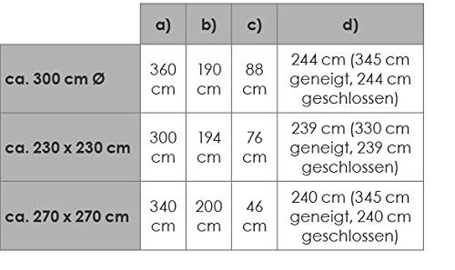 Dieser Sonnenschirm ist ein quadratischer Ampelschirm in der Größe 230 x 230 cm. Die Bespannung mit air-vent besteht aus 100 % Polyester. Sie ist mit einer Stärke von 180 g/m² sehr widerstandsfähig und verrottungsfest. Der Bezug ist ohne Volant gefertigt, wodurch die junge Denkschrift betont wird. Zudem verfügt Sie über eine wasserabstoßende Imprägnierung, wodurch Sie auch bei einem leichten Schauer keine Sorge haben müssen nass zu werden. Gemäß dem australisch/neuseeländischem Standard liegt der UV-Abschirmung für diesen Schirm bei 50+, womit Sie ausgezeichnet vor der direkten Sonneneinstrahlung geschützt sind.
