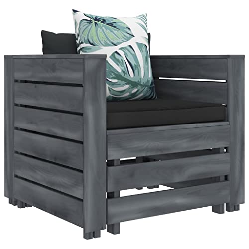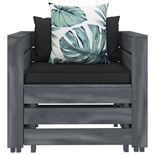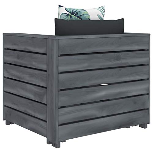Holzfarbe: Grau,Kissenfarbe: Blumenmuster und Schwarz,Material: Kiefernholz, Stoff (100% Polyester),Abmessungen des Palettentisches: 60 x 60 x 36,5 cm (L x B x H),Abmessungen des Palettensessels: 78 x 70 x 65,5 cm (B x T x H),Sitzhöhe vom Boden: 36,5 cm,Sitzkissen-Dicke: 6 cm,Rückenpolster-Stärke: 13 cm,Geeignet für den Innen- und Außenbereich,Belieferung enthält:,1 x Palettentisch / Ottomane,1 x Palettensessel,1 x Sitzpolster,1 x Rückenkissen,1 x Kissen mit Pflanzenmotiv.