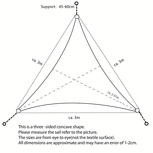 INSTALLATION UND ABMESSUNG – Enthält 5 m lange Seile und Metall-D-Ringe, die eine Installation der Markise ermöglichen. dass aufgrund der konkaven Form die Mittenbreite des Segels kürzer und der tatsächliche Beschattungsbereich kleiner ist. Die Größendaten sind der Distanz zwischen den Scheitelpunkten der horizontalen Ecken, nicht die Länge und Breite des tatsächlichen Schattierungsbereiches. Einen Distanz von ca. 45-60 cm von der Ecke des Stoffes zur Wand / Aussteifungsstelle einzuhalten.