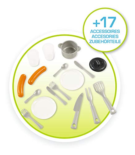 An der Außenwand des Spielhauses ist eine toll eingerichtete Küche montiert. Hier können Kinder ein tolles Menü für ihre Freunde und die ganze Familie zubereiten. Sie verfügt über einen (nicht funktionstüchtigen) Wasserhahn, eine Geschirrablage und eine Grillplatte für das nächste Barbecue. Die Würstchen sind auch schon mit dabei. Verschiedene Utensilien helfen dabei, das Essen zu kochen und es demnach auf den 2 Tellern zu servieren.