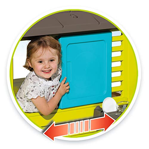 Wie ein echtes Haus: Das große Dach, die 2 Lamellenfenster, die 2 Schiebefenster und die blaue Eingangstür machen kleine Kinder zu stolzen Häuschenbesitzern