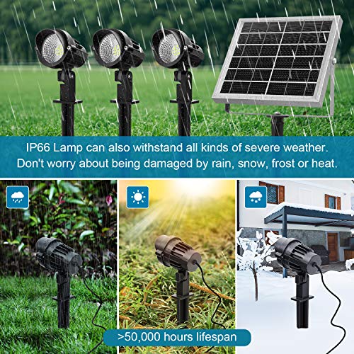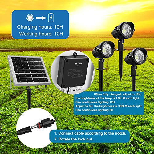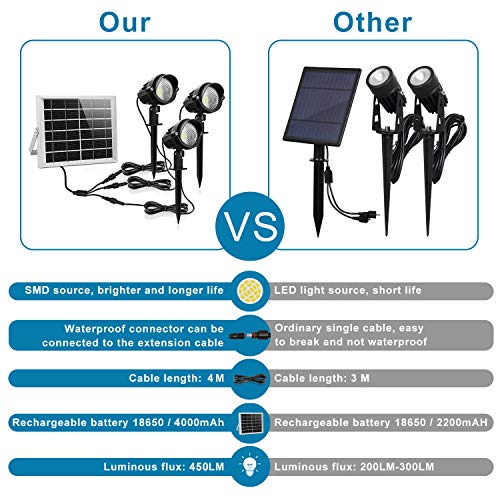 ◆ Superheller IP66 Wasserdichter Solarstrahler: 15 SMD LED Perle pro Leuchte, jede Leuchte 150LM, insgesamt ca. 450LM, heller und gleichmäßiger kaltweißer Strahl. Kräftige Solarleuchten strahlt fokussierte Beleuchtung auf weichem Untergrund. Durch das wetterfeste Gehäuse bleibt die Gartenleuchte vor Feuchtigkeit und Staub geschützt, stabil und langlebig. Der Schraubverschluss am Kabelanschluss der Solarlampe macht das Wasser komplett unzugänglich.