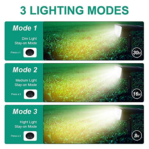 💡 【3 Helligkeitsbeleuchtung & Auto ON/OFF】 Die Garten Solarlampen resorbieren das Sonnenlicht tagsüber leicht,schalten sich in der Dämmerung automatisch ein und im Morgengrauen aufgebraucht. Solarleuchte Garten mit eingebaute Solar-aufladbare Batterie,3 Helligkeitsstufe : Schwaches Licht (Max. 30 Stunden) / Mittlerer Lichtmodus (max. 16 Stunden) / Hoher Lichtmodus (max. 8 Stunden).