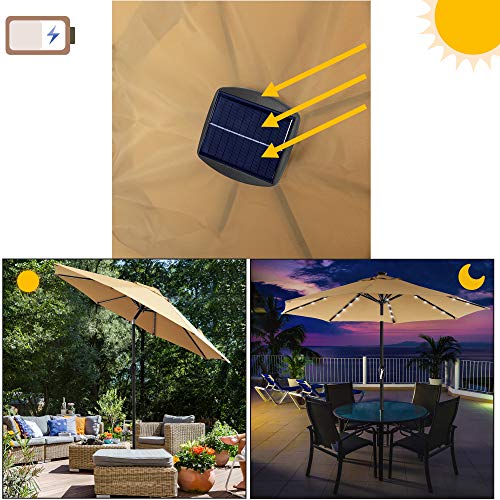 Schalten Sie das Licht ein: Möchten Sie beim Souper auf dem Balkon den Zwielicht genießen? Sie müssen sich nicht ins Haus annullieren, sobald es dunkel wird! Dieser Sonnenschirm ist an den Schirmrippen mit 32 LED-Lämpchen versehen, welche von einem Solarpanel mit Strom versorgt werden – eine romantische Atmosphäre für die nächsten 6-8 Stunden!