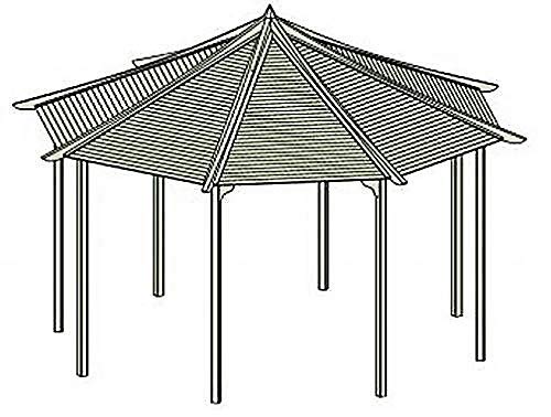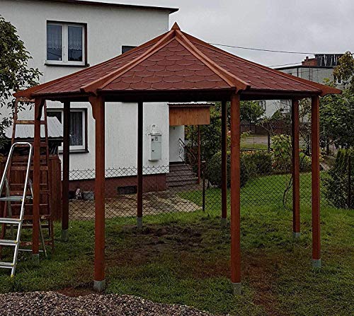 IN STANDARD-SET: Schindeln 12m2, 8 x Pfosten 70mm x 70mm, 16 x Pfostenschrauben, Aufbauenanleitung, Tasche mit Hilfe von Schrauben, 1 x Winkelmesser, 8 x Holzbalken sondern die Dachbindung, 16 fertige Lamellen sondern Dachplatten, 8 Holzdachplatten (Verkleidung), Metallkreuz-Sparrenverbindung, Holzspitze, 8 Holzsparren, 16 x Metallstützen