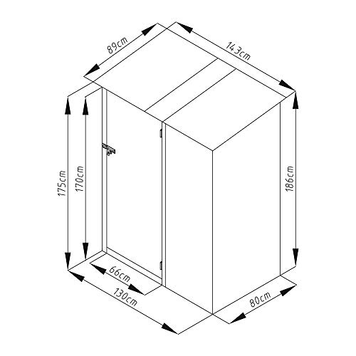 Dieser Praktische Geräteschuppen bietet genügend Platz für Ihre Garten-Utensilien. Das Material ist wetterbeständig gegen Sonne, Regen und Schnee – Das Stahlbleck ist verzinkt und lackiert