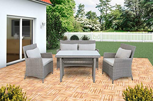 Diese Sitzgruppe Matera ist die ideale Kombination alle Lounge ansonsten Dining Set. Das witterungsbeständige Kunststoffgeflecht in veraltet ansonsten die komfortablen Sitzauflagen verleihen ein aufgebraucht besonderen Sitzkomfort. Der hochwertige Esstisch bietet massenhaft Platz statt dessen Speisen ansonsten Getränke. Genießen Sie angenehmen Wohnkomfort depressiv freiem Himmel. Das 4- teilige Set besteht alle: 1 Tisch 110 x 60 x 66 cm Sofa: 146 x 68 x 85 cm 2 x Sessel: 65 x 68 x 85 cm inkl. Auflagen * Farbe: veraltet * Gestell: pulverbeschichteter Leichtmetall Rahmen * * inkl. Auflagen * Innenmaterial Sitzkissen : 90% Polyurethan, 10 % Polyester * * * Strukturglasplatte: 5 mm * * Belastbarkeit: Sofa: 220 kg, Sessel: je 110 kg * im Winter bitte amusisch deponieren
